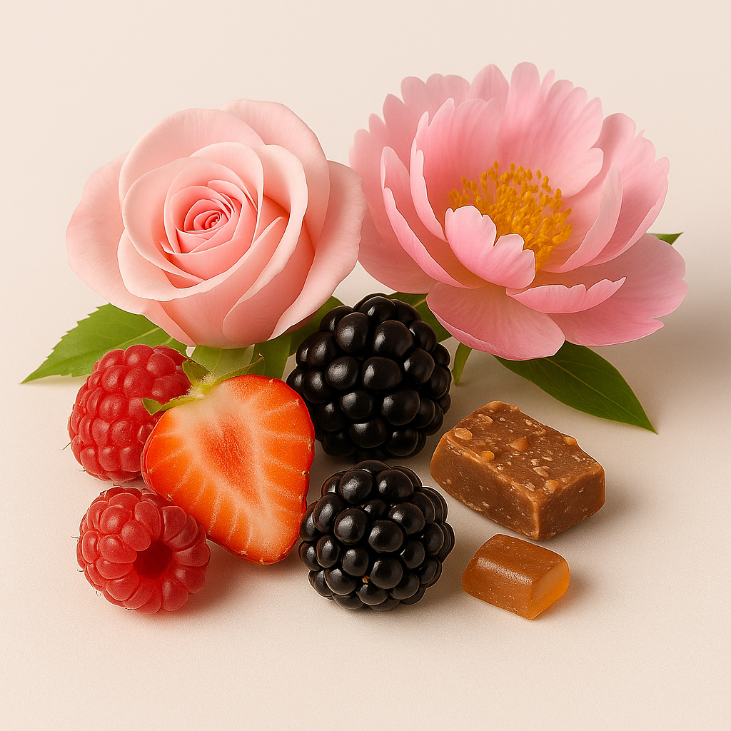 Note de cœur: Rose de Mai, Rose, Pivoine.