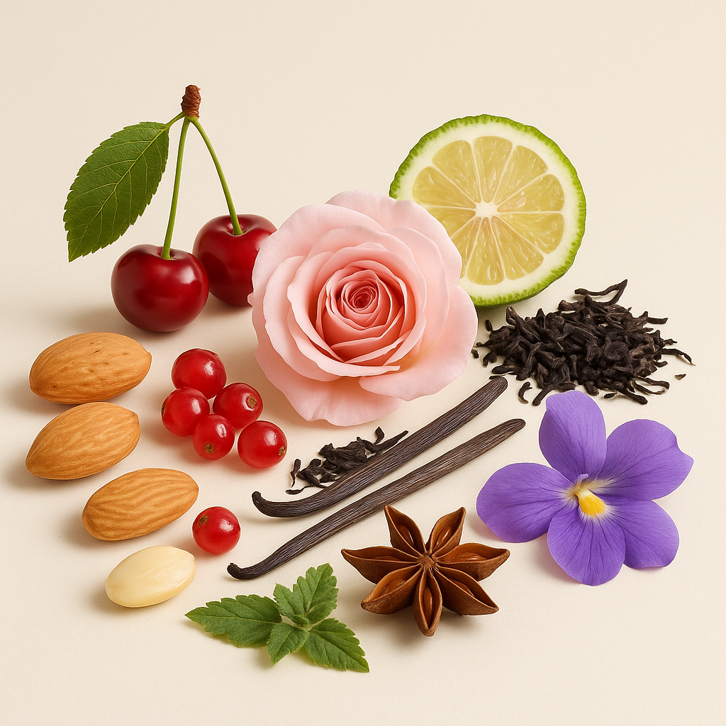 Note de tête: Cerise acide (griotte), Amande, Baies rouges, Bergamote.